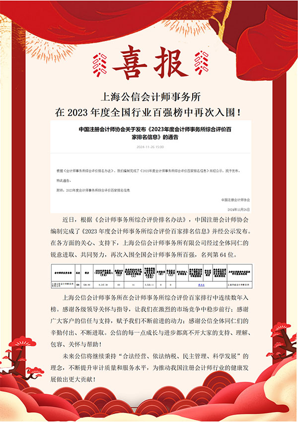 上海公信會計(jì)事務(wù)所在2023年度全國行業(yè)百強(qiáng)榜中再次入圍